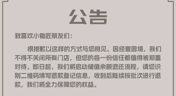 2月18日,小鋤匠壽喜燒(簡稱“小鋤匠”)發(fā)公告稱:“因經(jīng)營困境,我們不得不關(guān)閉所有門店……即日起,我們將啟動儲值余額退還流程,后陸續(xù)按批次進(jìn)行退款……”
