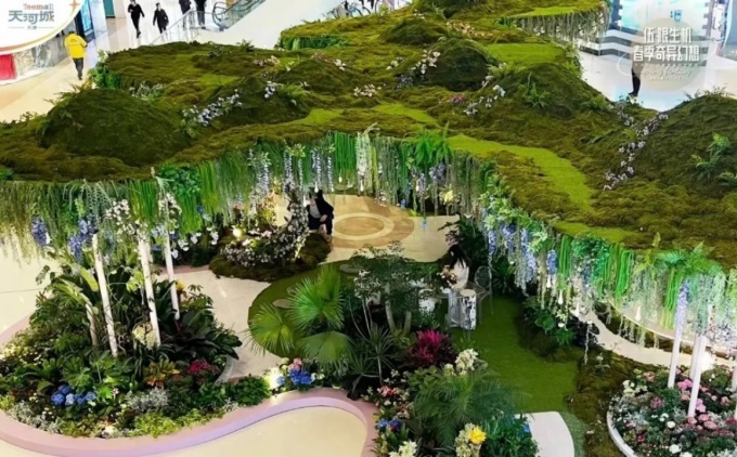 此外,自然元素突出也是春季美陳的一大特點,春季美陳的核心是展現(xiàn)自然之美,植物、花卉、樹木等元素能直接喚起人們對春天的聯(lián)想。櫻花樹、郁金香花海、草地等設計,能讓顧客仿佛置身于大自然中。這些一般都會在中庭布置大型花卉裝置,櫥窗設計成花園或森林場景,甚至在地面鋪設仿真草坪,增強沉浸感。
