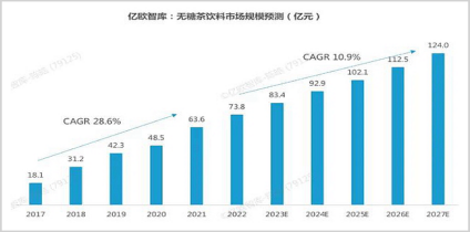 隨后,冰激凌品牌“甄稀”,也在成都開出冰激凌蛋糕實(shí)體店。但這些多元化產(chǎn)品的宣傳與推廣聲量,遠(yuǎn)不如此次無糖茶飲的高舉高打,也許是形勢所逼的必須求活,還是經(jīng)過“三得利”烏龍茶1997年入華遇冷,“伊藤園”系列艱難扛過年銷不足千萬不堪回首的歲月,還是“農(nóng)夫山泉”東方樹葉以前5年累計虧損超3億換來的市場積淀,亦或是“元?dú)馍帧比疾柘盗屑せ钅贻p市場完成了顧客教育。總之,市場向好,蛋糕巨大確是無可置疑。尼爾森IQ數(shù)據(jù)顯示,2023年無糖茶飲市場增速迅猛,同比大漲110%,億歐智庫預(yù)計,2025年中國無糖茶市場規(guī)模將突破百億,短短兩年后更有望達(dá)到124億。