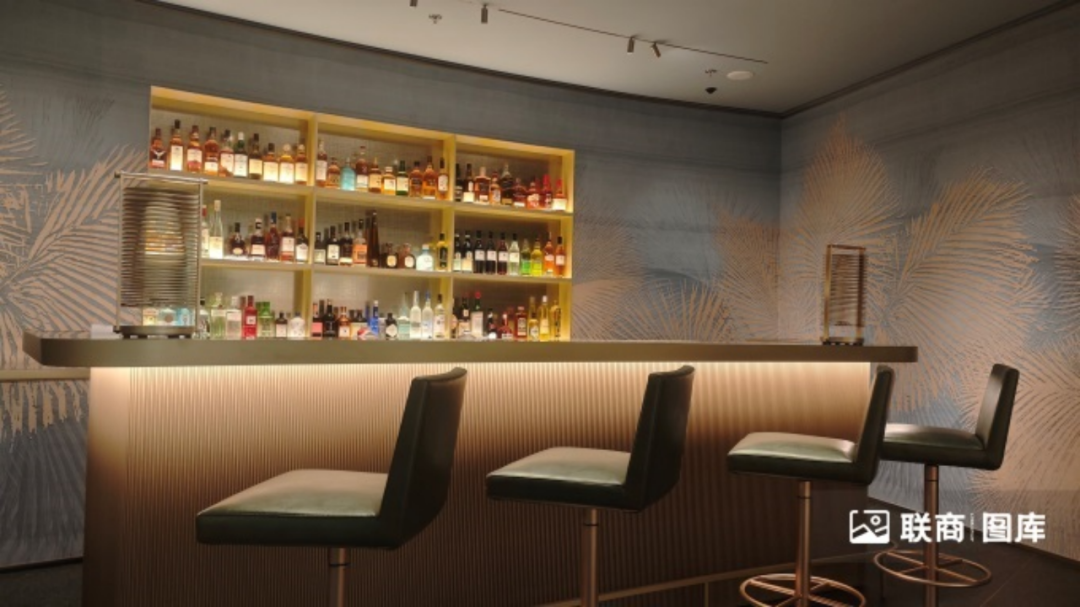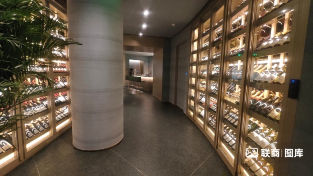兩個餐區(qū)之間則以一條鑲嵌開放式酒窖的走廊連接,走廊前面設(shè)置有吧臺和休息區(qū)。