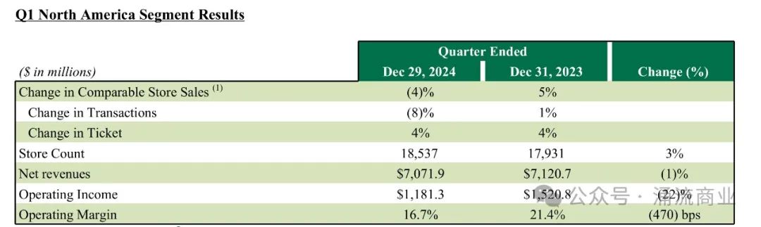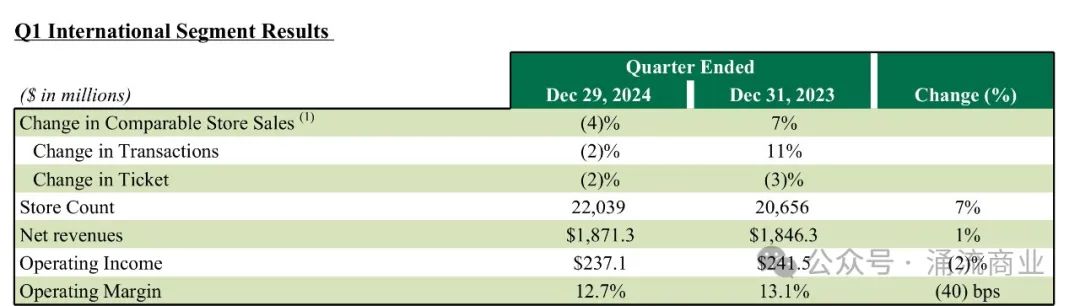 他還需要更多時間,在截至12月29日的2025財年第一季度中,全球同店銷售額仍舊下降了4%。這是倪睿安引領(lǐng)轉(zhuǎn)型的第一個完整季度。截至季度末,美國和中國的門店合計占比為61%,分別擁有17,049家和7,685家門店。