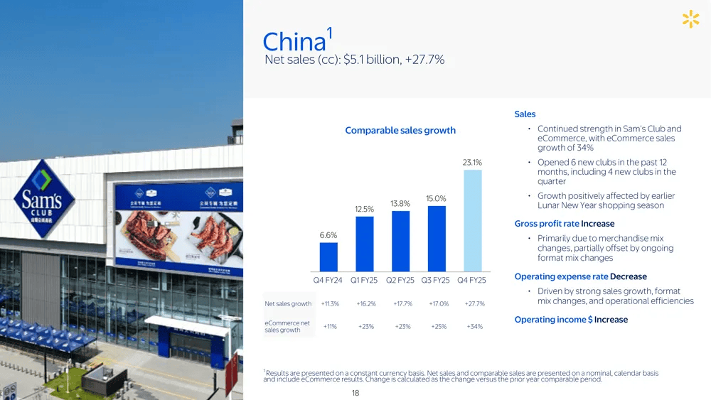 第四季度表現(xiàn)尤為亮眼,凈銷售額達51億美元,同比激增27.7%,可比銷售額增長23.1%,遠超此前三個季度的16.2%-17.7%漲幅,成為沃爾瑪全球增長最快的市場。