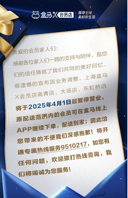 上海盒馬X會員店3家門店將于4月1日起停止?fàn)I業(yè)