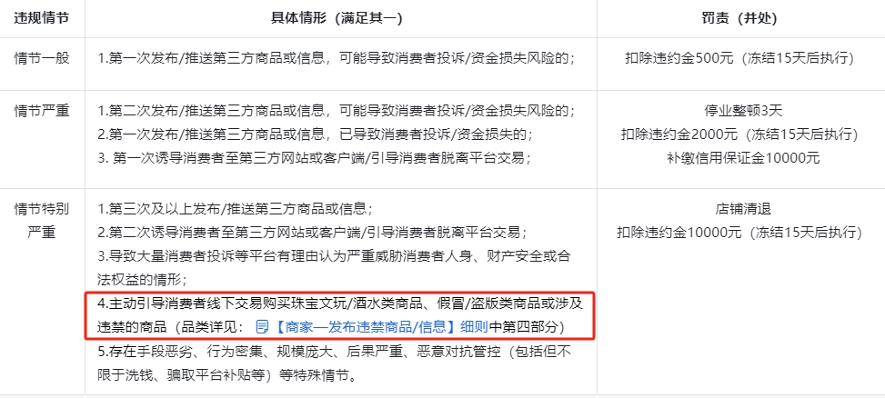 平臺(tái)將根據(jù)違規(guī)情節(jié)的輕重程度,實(shí)施分級(jí)處罰措施:情節(jié)一般的商家將被扣除500元違約金;情節(jié)嚴(yán)重者將面臨停業(yè)整頓3天,并需補(bǔ)繳1萬(wàn)元信用保證金的處罰;而情節(jié)特別嚴(yán)重者,則將被直接清退店鋪,并面臨最高1萬(wàn)元的罰款。