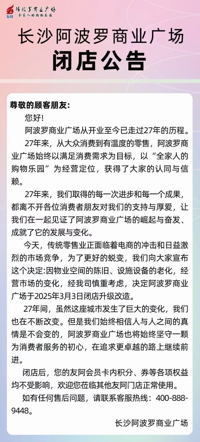 3月2日,友阿集團(tuán)旗下的長(zhǎng)沙阿波羅商業(yè)廣場(chǎng)發(fā)布閉店公告,宣布將于2025年3月3日正式閉店,進(jìn)行升級(jí)改造。