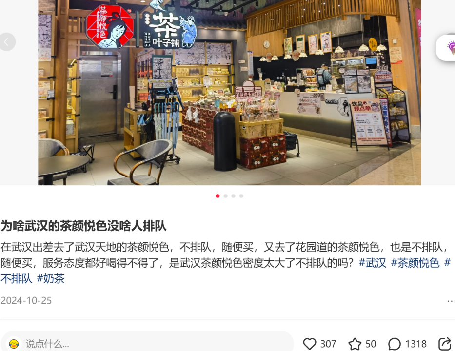 以武漢為例,一位博主發(fā)布了題為《為啥武漢的茶顏悅色沒人排隊(duì)》的筆記,收獲了1318個(gè)點(diǎn)贊與眾多認(rèn)同。筆記中提到:“我出差去武漢天地打卡茶顏悅色,無需排隊(duì),直接就能購(gòu)買,再到另一家茶顏悅色門店,同樣也沒有排隊(duì)現(xiàn)象。”