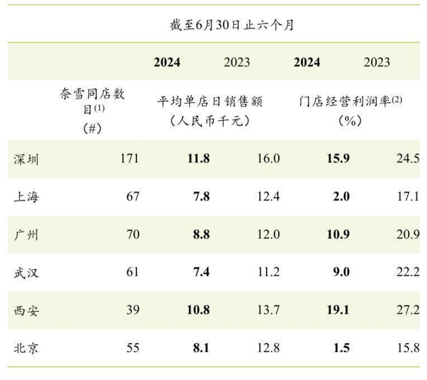 以深圳為例,截至2024上半年,奈雪同店數(shù)量為171家,平均單店日銷售額為11800元,去年同期為16000元,門店經(jīng)營(yíng)利潤(rùn)率為15.9%,去年同期為24.5%。