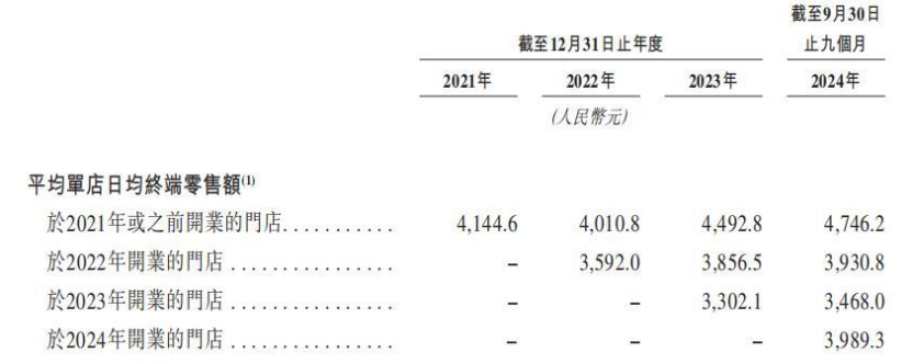 從招股書披露的“平均單店日均終端零售額”也可以看到,蜜雪冰城現(xiàn)有的加盟門店質(zhì)量有所下降。2023年加盟開業(yè)的門店與2021年或之前開業(yè)的門店相比,平均單店日均終端零售額大幅減少。截至2024年第三季度,2021年及以前開業(yè)的門店零售終端平均能賣出4746.2元/天,而2023年開業(yè)的門店僅有3468元/天。