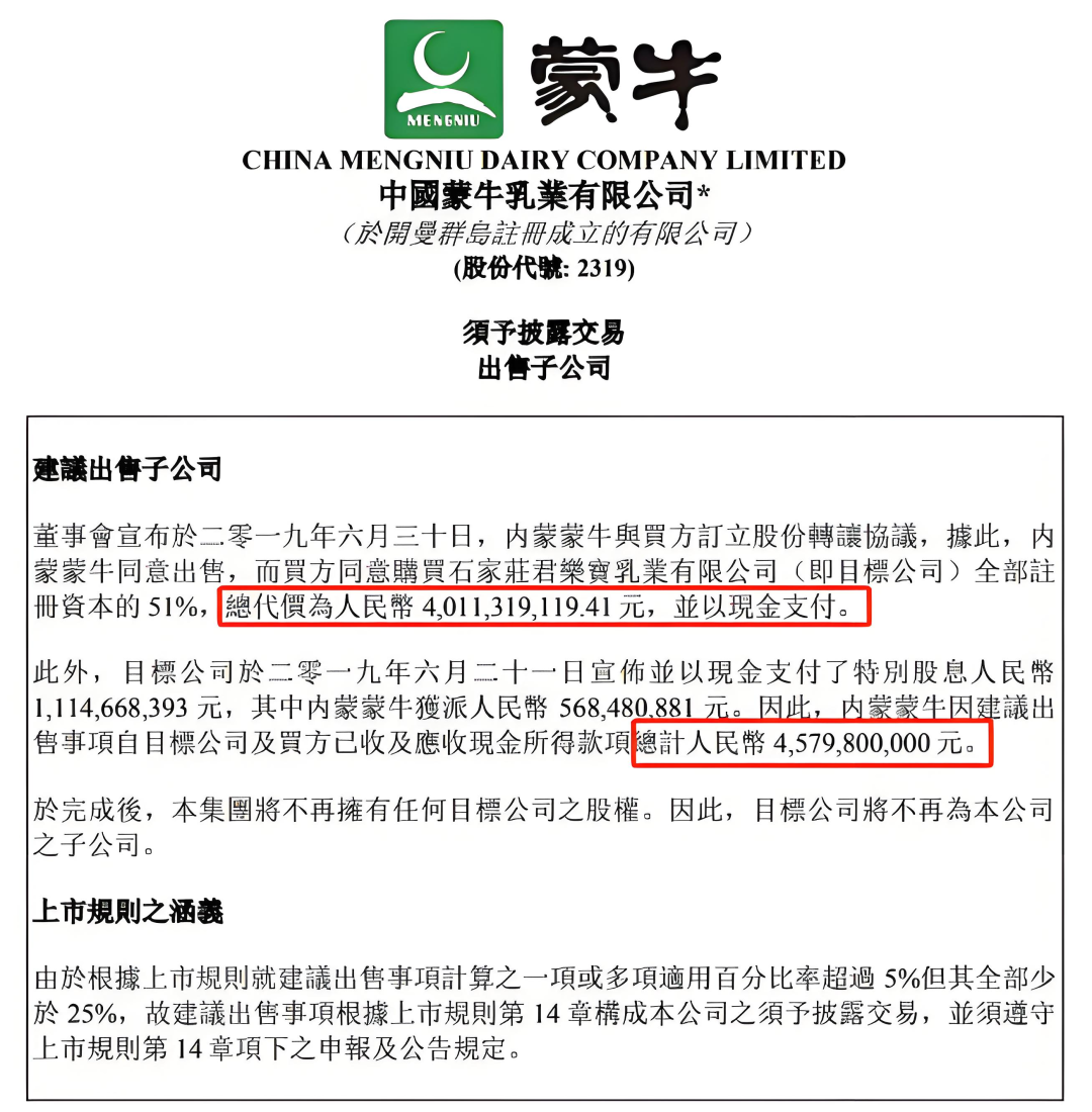 持續(xù)了三年的談判幾經(jīng)波折,最終蒙牛于2019年以40.11億元的價(jià)格,出售了當(dāng)初4億元收購而來的君樂寶51%股權(quán),但同時(shí)留下了奶粉業(yè)務(wù)上的一個(gè)窟窿。