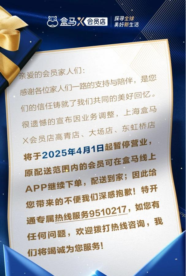 2月28日,盒馬X會員店發(fā)布公告稱,因業(yè)務(wù)調(diào)整,上海盒馬X會員店高青店、大場店、東虹橋店將于2025年4月1日起暫停營業(yè),公告顯示,原配送范圍內(nèi)的會員可在盒馬線上APP繼續(xù)下單,配送到家。