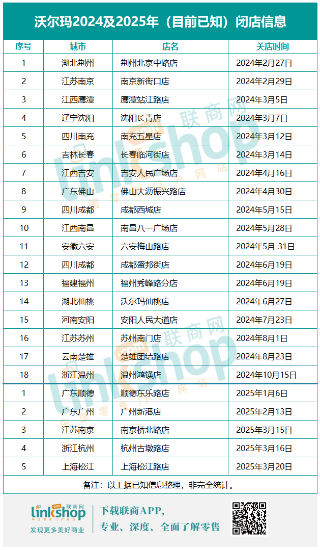 一方面,以“合約到期”的名義大量關(guān)閉低效門店,門店數(shù)量持續(xù)減少。2024年初,有統(tǒng)計(jì)數(shù)據(jù)顯示,沃爾瑪兩年半內(nèi)關(guān)閉近60家。而據(jù)聯(lián)商網(wǎng)不完全統(tǒng)計(jì),2024年至今,沃爾瑪再關(guān)店23家。