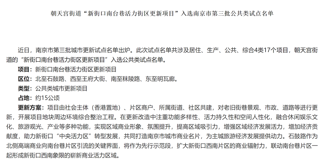 由于項(xiàng)目地處新街口西南象限,2023年香港置地同時(shí)參與了由秦淮區(qū)政府牽頭的朝天宮街道”新街口南臺巷活力街區(qū)更新項(xiàng)目“。