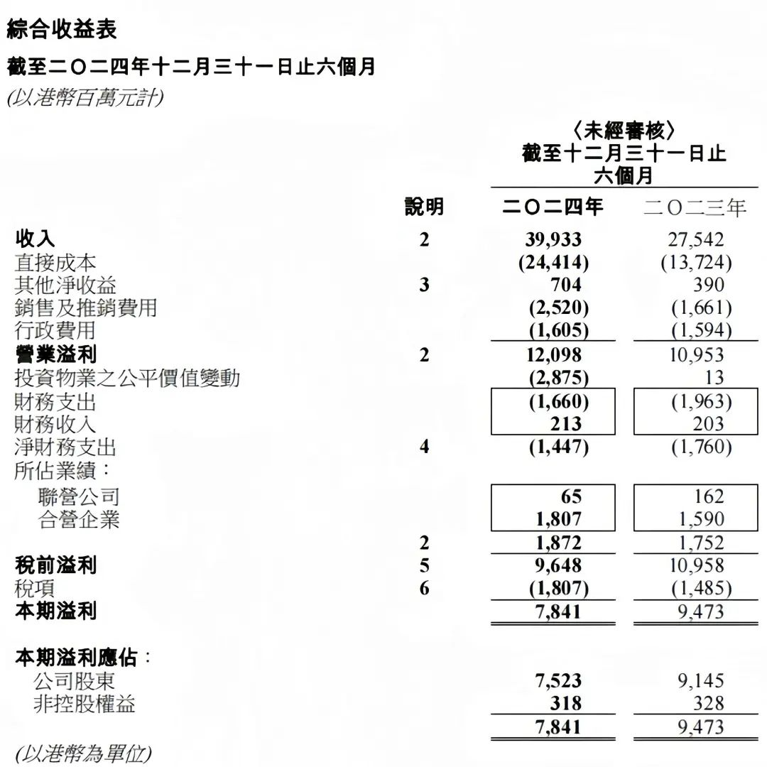 2月27日,中國香港最大地產(chǎn)發(fā)展商之一的新鴻基地產(chǎn),披露了2024/2025年度中期業(yè)績,報告期為2024年7月1日至2024年12月31日之間的6個月。