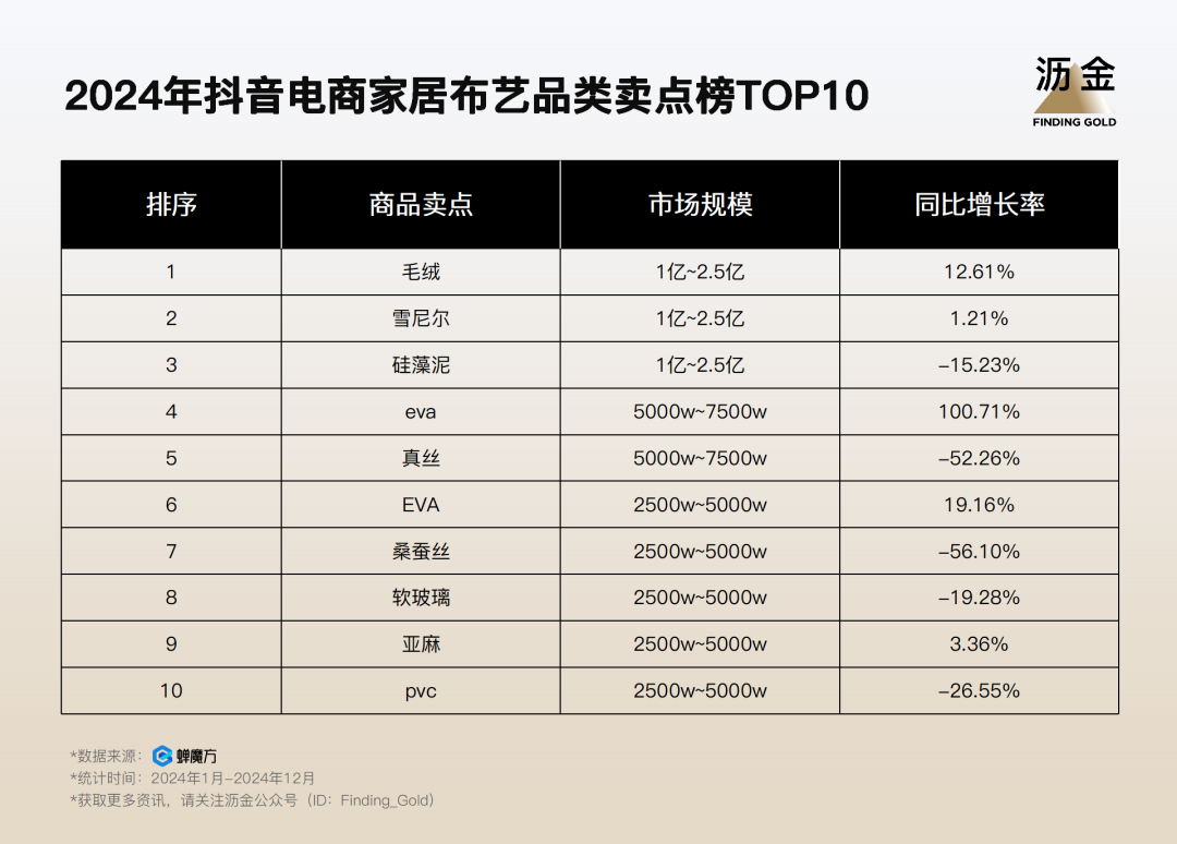 以家居家紡品類為例,2023年上半年,天貓毛絨布藝類產(chǎn)品銷售額激增29.2%,其中200-400元價(jià)位段增長最猛。抖音電商也符合這個(gè)特征,2024年“毛絨”質(zhì)地的賣點(diǎn)體量最大,并且保持了較高的增長速度。