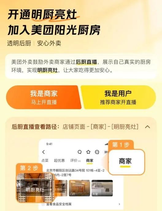 近日,美團(tuán)還宣布將大力推動(dòng)“明廚亮灶 陽光廚房”,鼓勵(lì)餐飲商家通過后廚直播的形式,全面展示食品加工過程。并啟動(dòng)“明廚亮灶”專項(xiàng)流量扶持計(jì)劃,扶持優(yōu)質(zhì)商家。