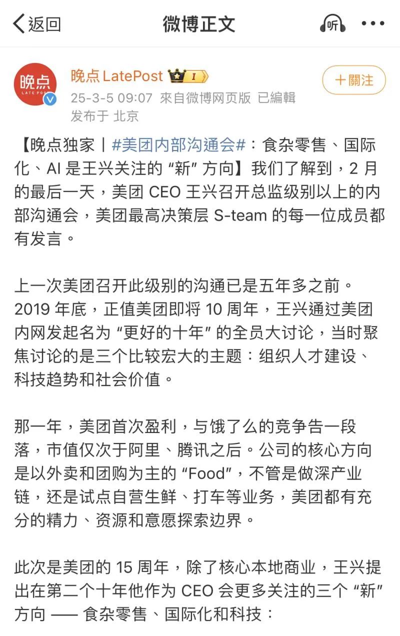 據(jù)晚點(diǎn)LatePost獨(dú)家消息,2月底,美團(tuán)CEO王興召開了一場(chǎng)總監(jiān)級(jí)別以上的內(nèi)部溝通會(huì)。