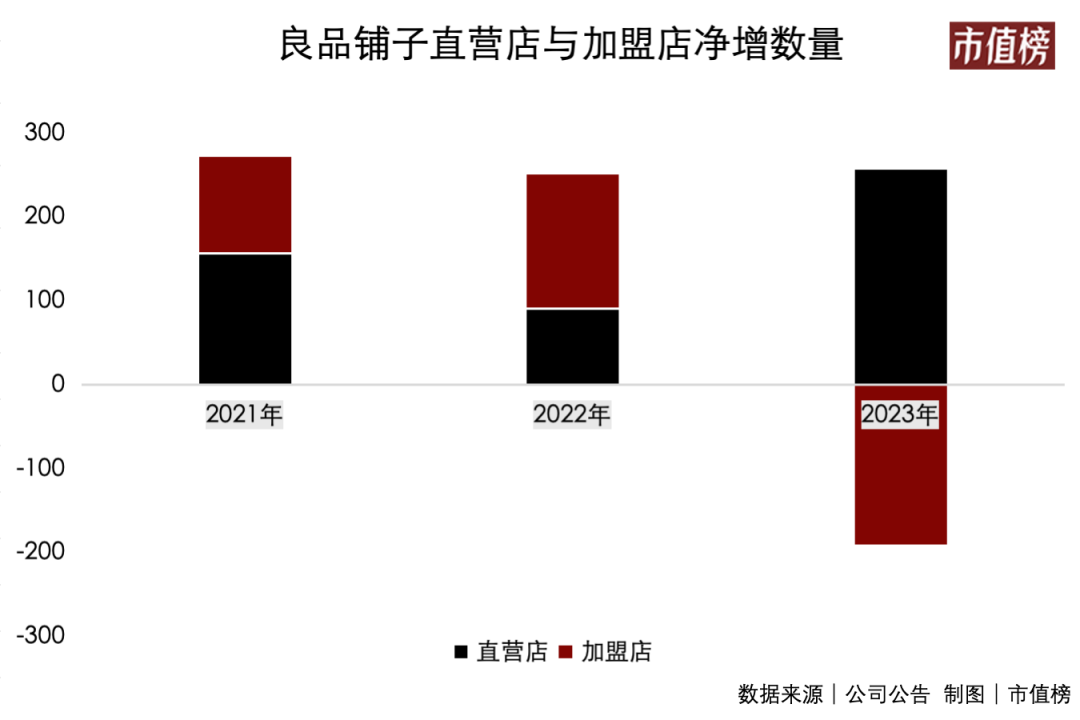2022年、2023年,良品鋪?zhàn)臃謩e新開(kāi)661家和567家門(mén)店,不過(guò)新開(kāi)的門(mén)店中,加盟門(mén)店在2023年銳減,從495家降至197家。2023年,良品鋪?zhàn)蛹用说陜魷p少191家,直營(yíng)店則凈增加258家。