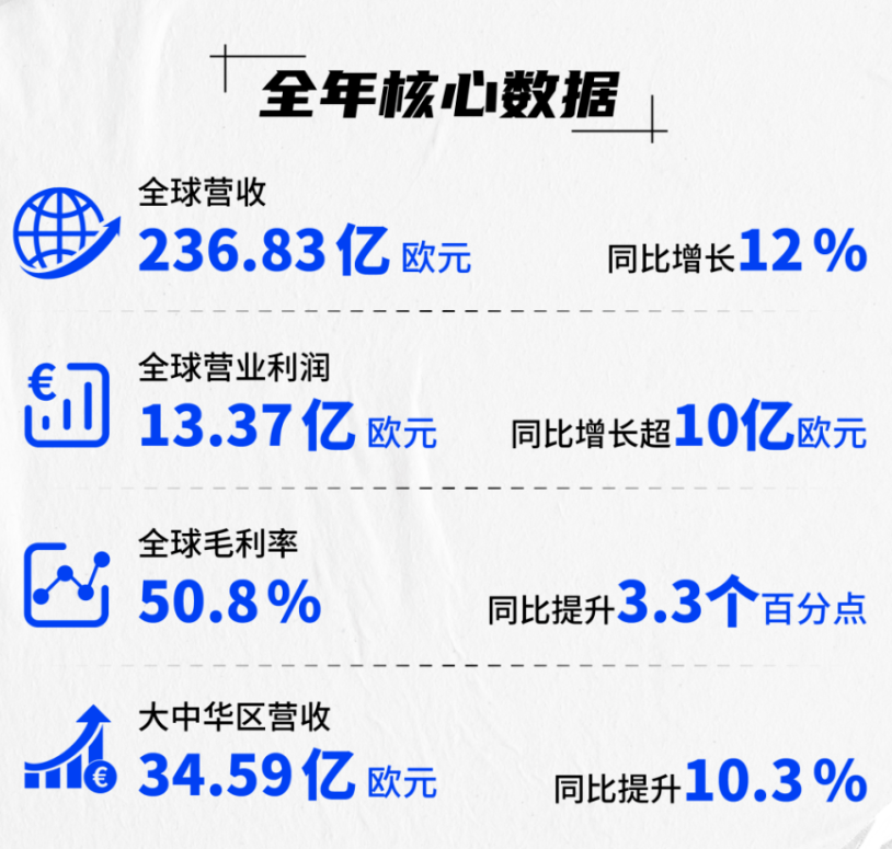 從2024年全年來看,阿迪達(dá)斯全球營(yíng)收236.83億歐元,在貨幣中性下(下同)較上年同期增長(zhǎng)12%;營(yíng)業(yè)利潤(rùn)同比增長(zhǎng)超10億歐元,達(dá)到13.37億歐元;毛利率也較上年同期提升3.3個(gè)百分點(diǎn)至50.8%。