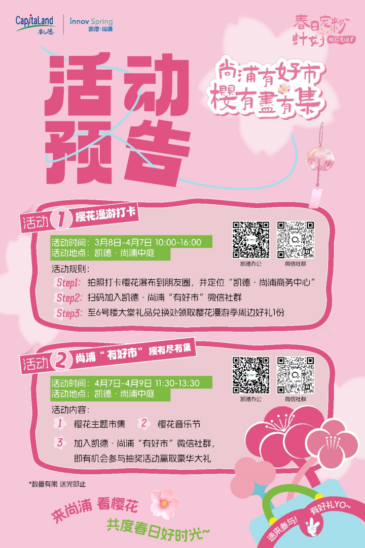 凱德·尚浦 春日寵粉計(jì)劃活動(dòng)一:櫻花漫游打卡活動(dòng)時(shí)間:3.8-4.7 10:00-16:00活動(dòng)地點(diǎn):凱德·尚浦中庭活動(dòng)內(nèi)容:Step1:拍照打卡櫻花瀑布到朋友圈,并定位“凱德·尚浦商務(wù)中心” ;Step2:掃碼加入凱德·尚浦“有好市”微信社群;Step3:至6號(hào)樓大堂禮品兌換處領(lǐng)取櫻花漫游季周邊好禮1份。