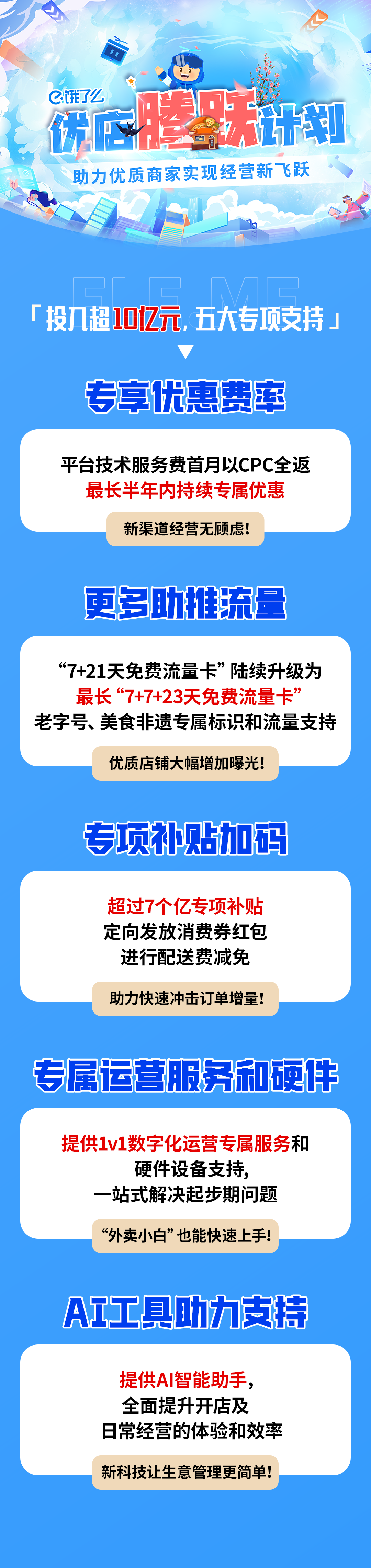 3月3日,餓了么對外宣布啟動“優(yōu)店騰躍計劃”:在2025年,餓了么將面向商家投入超過10億元,在費率優(yōu)惠、專項補貼、專屬流量、數(shù)字化運營服務和硬件設施以及AI技術能力等多方面,持續(xù)加大對商家支持投入,助力線下優(yōu)質(zhì)餐飲商家進一步躍升數(shù)字化經(jīng)營能力、收獲新渠道生意增量。