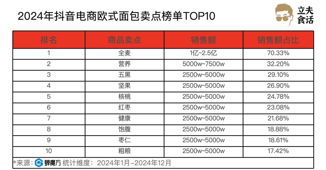 2024年數(shù)據(jù)顯示,全麥面包在歐式面包中的銷售額占比最高,達(dá)到70.33%,同比激增203.52%。
