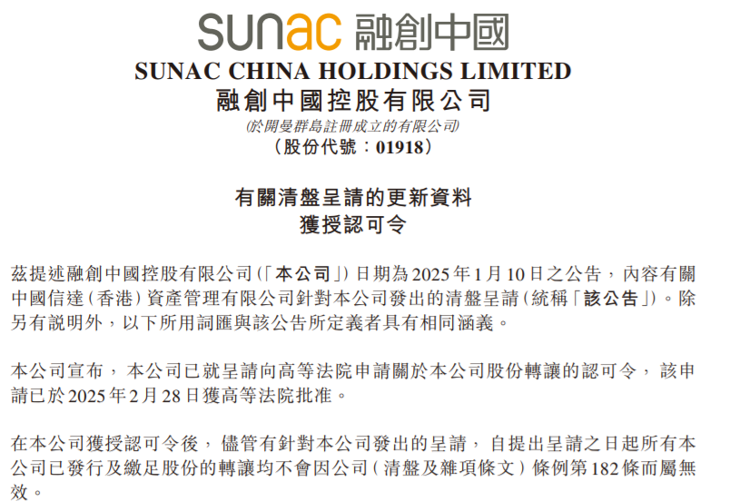 2月28日,融創(chuàng)中國發(fā)布公告稱,有關中國信達(香港)資產(chǎn)管理有限公司針對該公司發(fā)出的清盤呈請,公司已就呈請向高等法院申請關于公司股份轉(zhuǎn)讓的認可令,該申請已于2月28日獲高等法院批準。