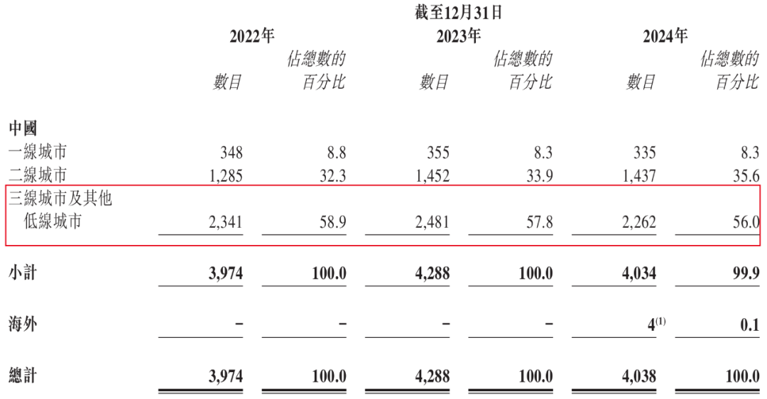 或許考慮到品牌的局限性,周六福沒有將門店集中在一二線城市,而是選擇重倉三線及以下層級城市。2022年至2024年,周六福三線及其他低級城市的門店占比分別為58.9%、57.8%及56.0%。