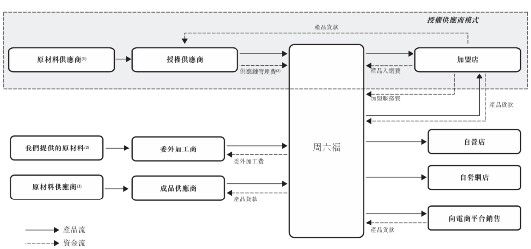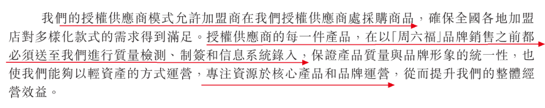 在授權(quán)供應商模式下,周六福允許加盟商在授權(quán)供應商處直接采購商品,周六福會對這些產(chǎn)品進行質(zhì)量檢測、制簽和信息系統(tǒng)錄入,入網(wǎng)至產(chǎn)品網(wǎng)絡,然后交付加盟商,使用“周六!逼放七M行銷售。