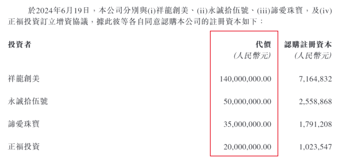 2024年6月19日,周六福分別與祥龍創(chuàng)美、永誠拾伍號、諦愛珠寶及正福投資訂立增資協(xié)議,四位投資方以19.54元/股的價格認購新增注冊資本,總代價2.45億元。