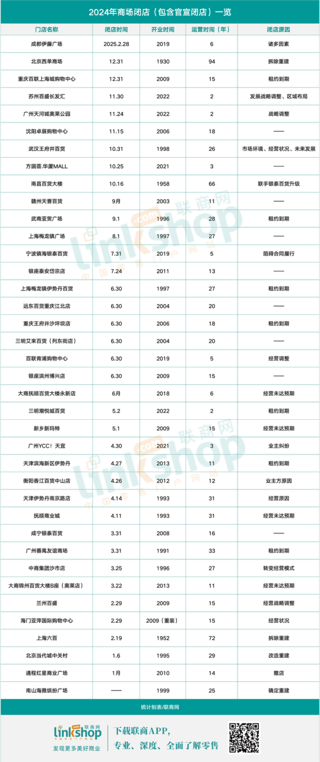 根據(jù)聯(lián)商網(wǎng)此前統(tǒng)計,2023年有21家知名商場宣布停業(yè)閉店,2024年,這一數(shù)字還在增加。
