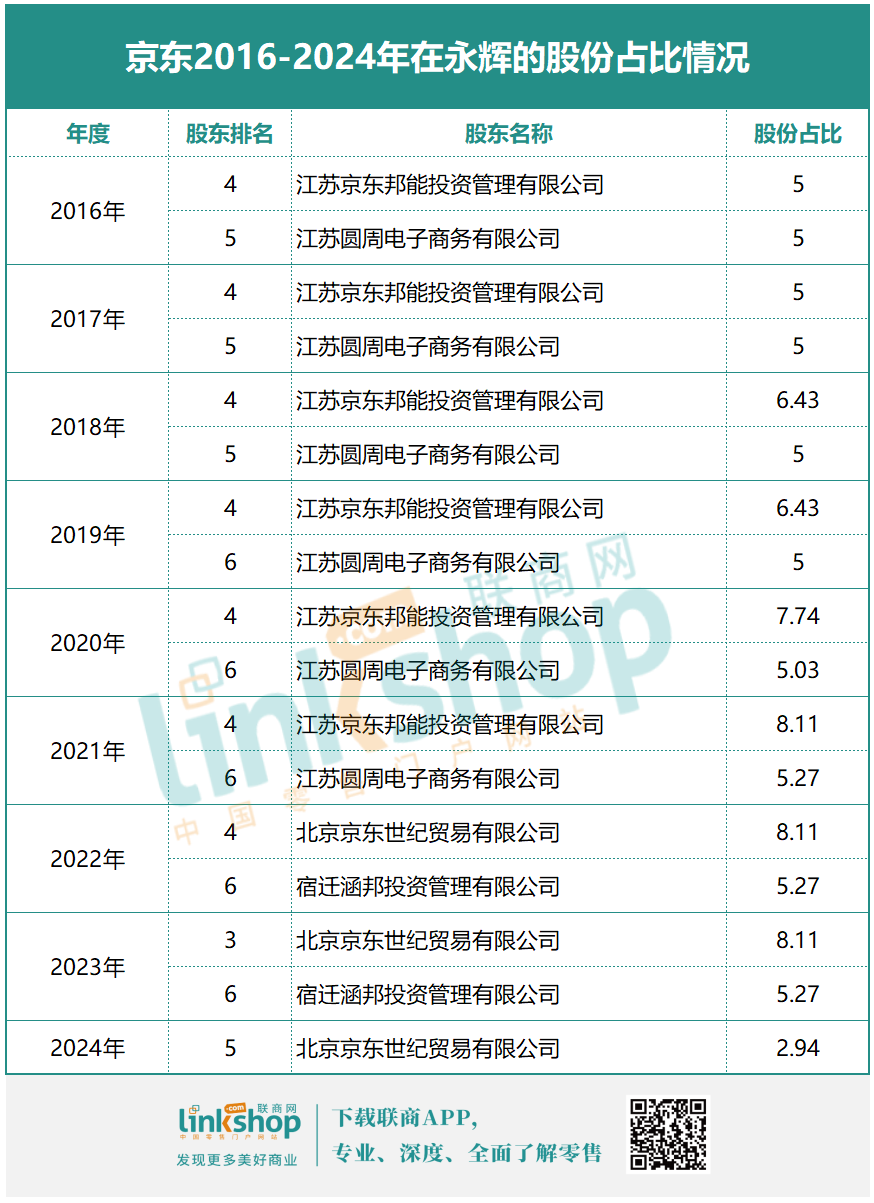2024年3月20日,京東首次通過(guò)競(jìng)價(jià)交易方式減持永輝超市不超過(guò)1%的股份,減持后股份不超過(guò)12.39%;2024年9月,京東世貿(mào)與牛奶有限公司、宿遷涵邦投資管理有限公司一起,出售了永輝超市29.40%股權(quán),廣東駿才國(guó)際商貿(mào)有限公司(名創(chuàng)優(yōu)品對(duì)其100%控股)以62.7億元收購(gòu)成為永輝超市第一大股東,名創(chuàng)優(yōu)品正式入主永輝超市;京東在永輝的股份保留2.94%。