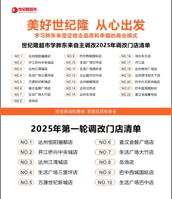 聯(lián)商快訊:3月10日,達(dá)州世紀(jì)隆正式宣布啟動(dòng)2025年新一輪調(diào)改計(jì)劃,調(diào)改門店名單出爐。