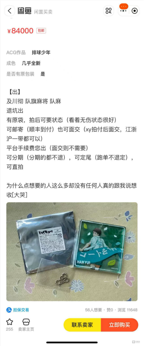 比如動漫《排球少年》中的人氣角色及川徹,其“吧唧”在二手平臺上已經(jīng)被炒到了8萬元以上,像這樣的稀有谷子也被稱為“海景谷”。