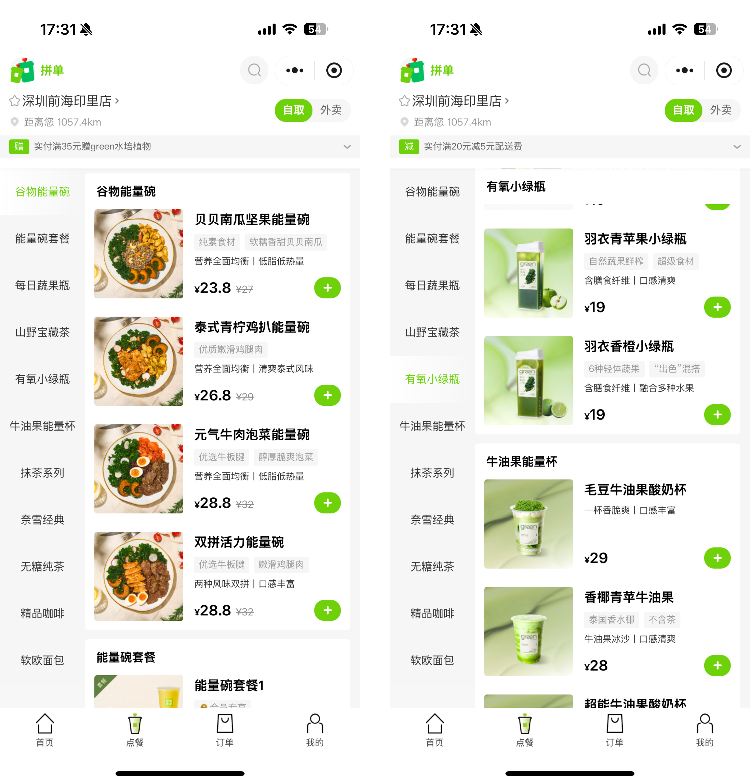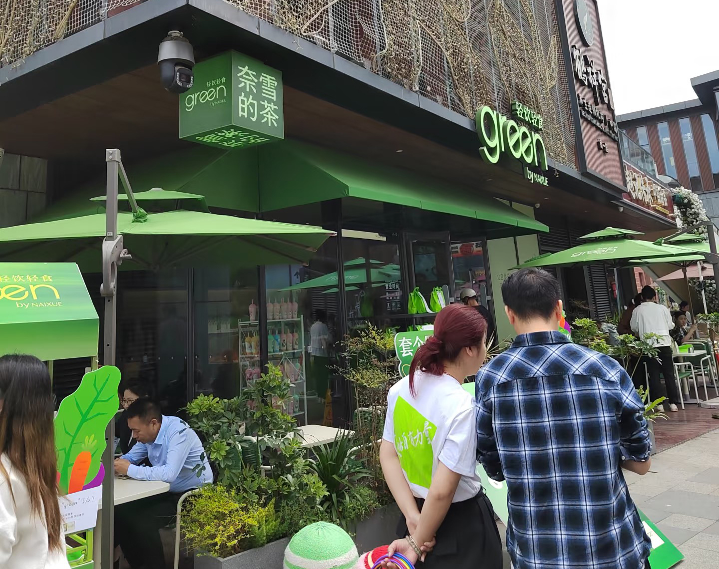從門店裝修看,整體以綠色為主色調(diào),延續(xù)奈雪經(jīng)典風(fēng)格的同時,凸顯輕食理念。門頭上除了“奈雪的茶”四個大字,還添加了“輕飲輕食品 green by NAIXUE”的字樣。