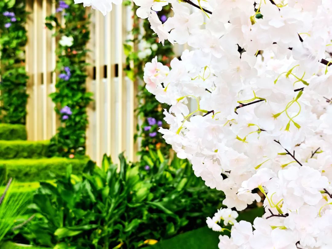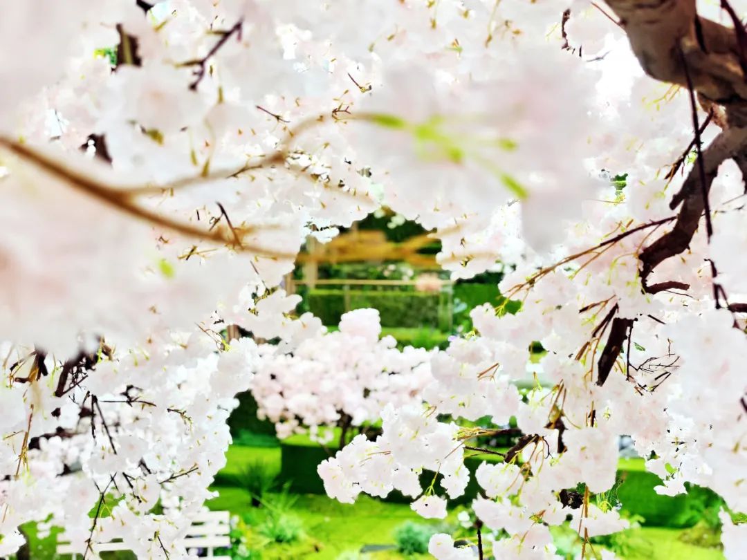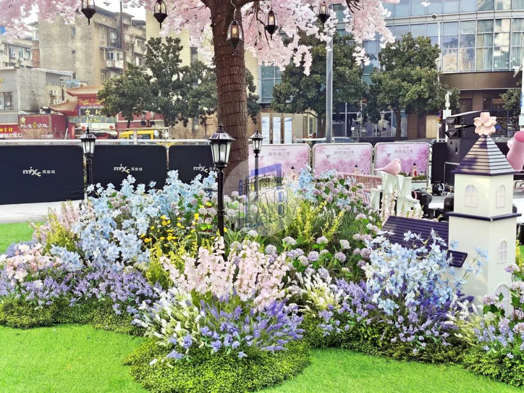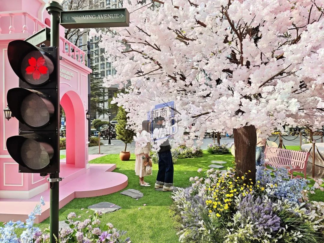 在外廣場、L1中庭、戶外大臺階、街區(qū)連廊等多處空間,「一顆繁櫻、春野浮綠、光影幻境、春日列車、春櫻漫野花園、春櫻漫野小鎮(zhèn)、流光花語」等不同意境且有連貫性的主題氛圍,構(gòu)成了一條可在商場內(nèi)CityWalk的春日漫游之徑。