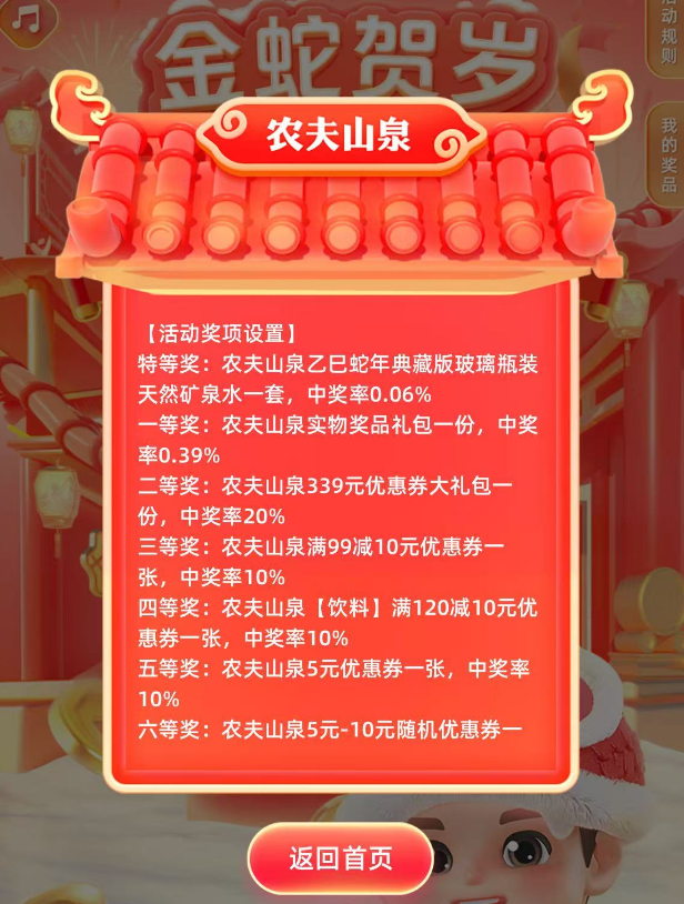如柑橘加工基地、茉莉花助農(nóng)、在云南收購茶葉等,在助力鄉(xiāng)村振興的同時也是豐富農(nóng)夫山泉茶飲料、果汁飲料產(chǎn)品矩陣的共贏之舉。而通過生肖水的抽獎方式可以發(fā)現(xiàn),除0.06%中獎率的生肖水和0.39%中獎率的實物禮包外,中獎率更高的是各類優(yōu)惠券,可以看做是一種增添了情緒價值的春節(jié)促銷方式。