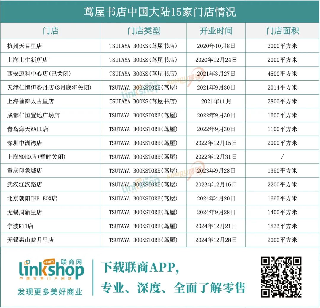 然而,中國的15家門店分別為以中高端店型的其中TSUTAYA BOOKS(蔦屋書店)和定位略低的TSUTAYA BOOKSTORE(蔦屋)兩種。其中杭州天目里店、上海上生新所、上海前灘太古里和已經(jīng)關(guān)掉的西安邁科中心店屬于TSUTAYA BOOKS,其余均是TSUTAYA BOOKSTORE店型。即便是四個中高端店型,也未達(dá)到代官山店的級別,更別說其他社區(qū)店了。