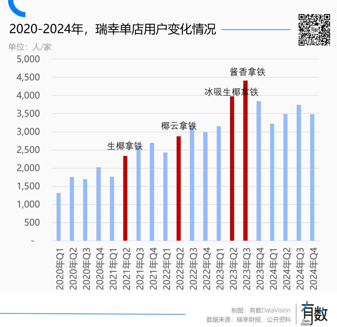 但在現(xiàn)象級(jí)的醬香拿鐵之后,瑞幸整個(gè)2024年都沒有爆款產(chǎn)品出現(xiàn),最終形成了單店用戶數(shù)量的下滑。