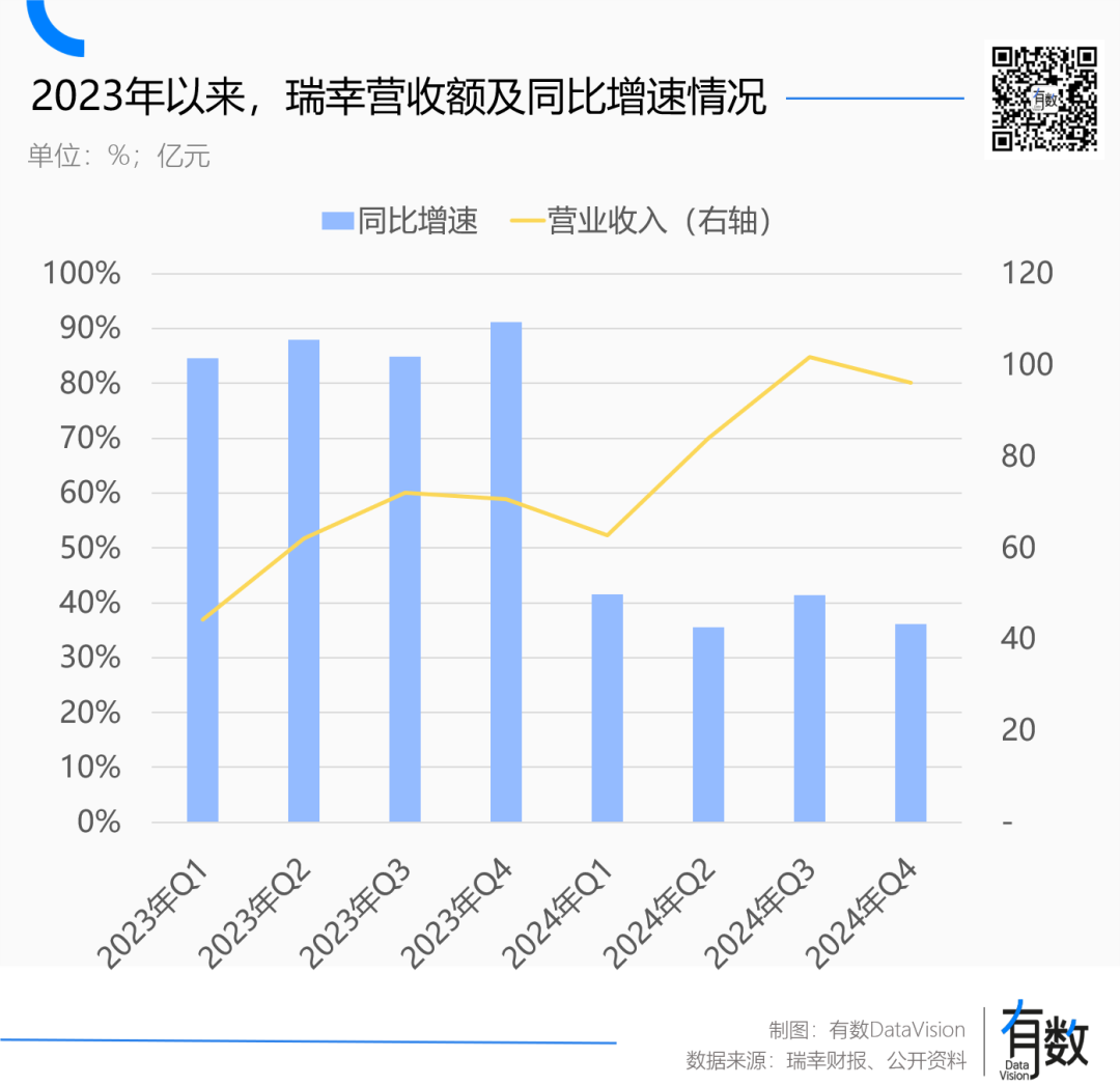 自2023年Q1以來,瑞幸門店凈增加數(shù)已連續(xù)七個(gè)季度超過一千家,是庫迪殺入前的3.3倍。同時(shí),瑞幸的門店總數(shù)相繼在2023年6月和2024年7月突破了一萬家和兩萬家。與之對(duì)應(yīng),瑞幸連續(xù)八個(gè)季度保持了35%以上的營(yíng)收增幅。