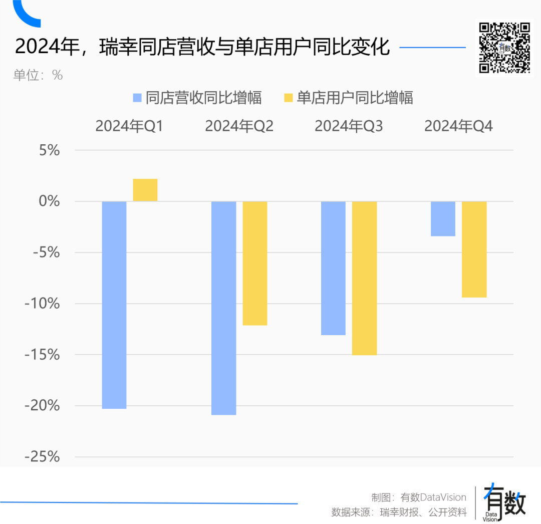 從財(cái)報(bào)數(shù)據(jù)看,2024年上半年,瑞幸門店收入的下滑大于單店用戶的下滑,說明收入下滑的關(guān)鍵因素在于客單價(jià)偏低。而2024年下半年,單店用戶下滑反而超過門店收入下滑,說明關(guān)鍵因素變成了用戶數(shù)量被稀釋。
