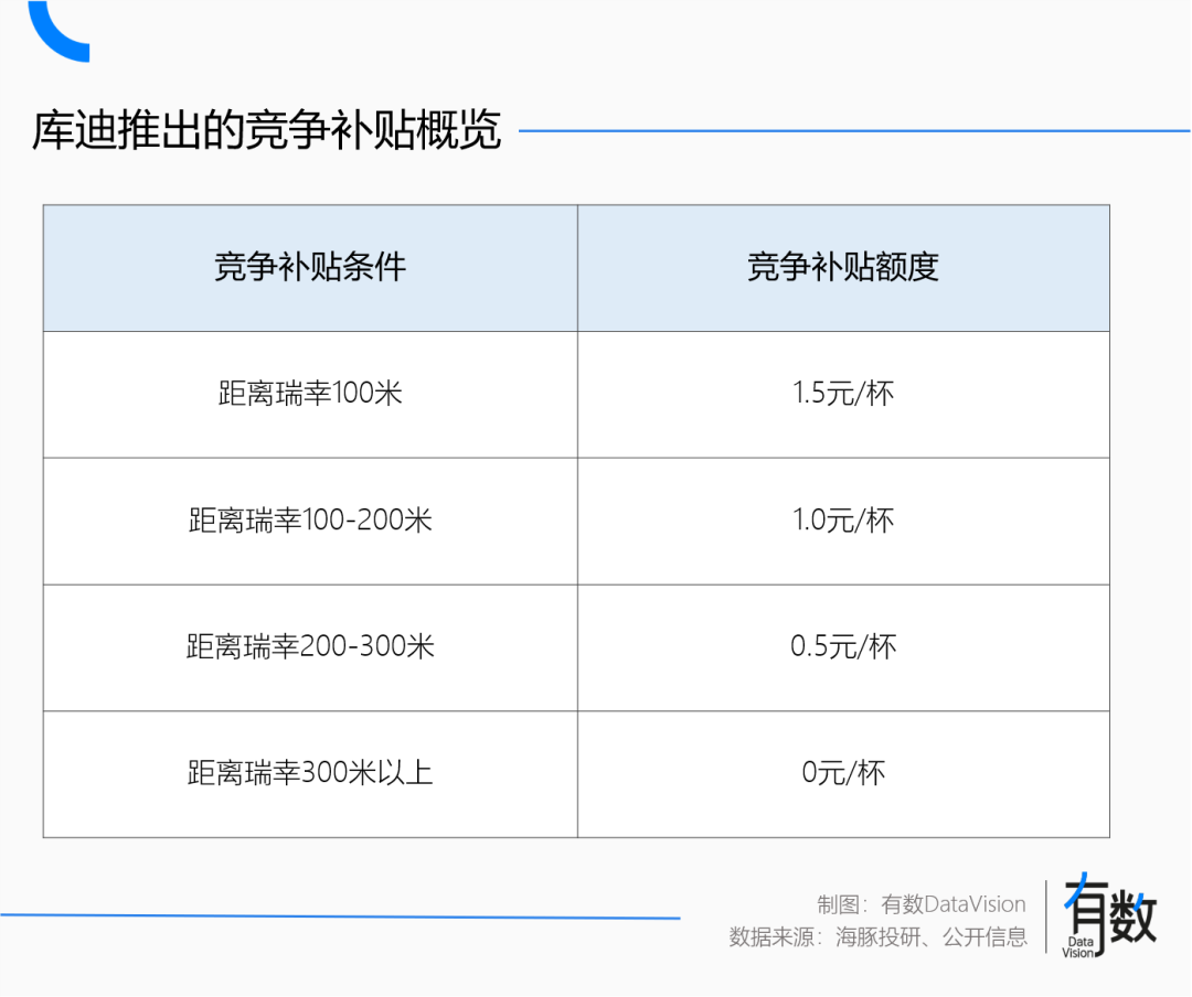 開店補(bǔ)貼的針對(duì)性也非常強(qiáng)——以瑞幸門店為圓心,離得越近補(bǔ)的越多,一百米以內(nèi)單杯高達(dá)1.5元。8個(gè)月后,庫迪門店突破5000家。
