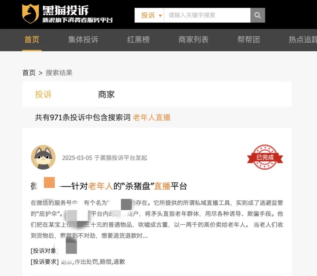 在黑貓投訴平臺上看到,與“老年人直播”相關(guān)的投訴已達近千條。而在眾多投訴內(nèi)容中,“私域直播間”因為更具隱蔽性,引起了驚蟄研究所的注意。