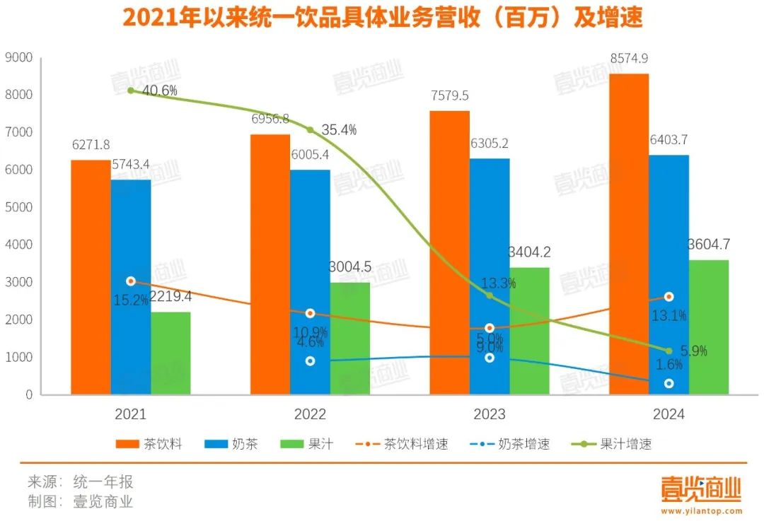 具體看,統(tǒng)一的飲品業(yè)務(wù)主要包括了茶飲料、果汁、奶茶、咖啡、包裝水等產(chǎn)品。其中,茶飲料是其最大的營(yíng)收來(lái)源。2024年,統(tǒng)一茶飲料收入85.75億元,占飲品業(yè)務(wù)總收入的44.57%,以13.13%的增速領(lǐng)跑飲料業(yè)務(wù),這也是該業(yè)務(wù)連續(xù)4年增長(zhǎng)。
