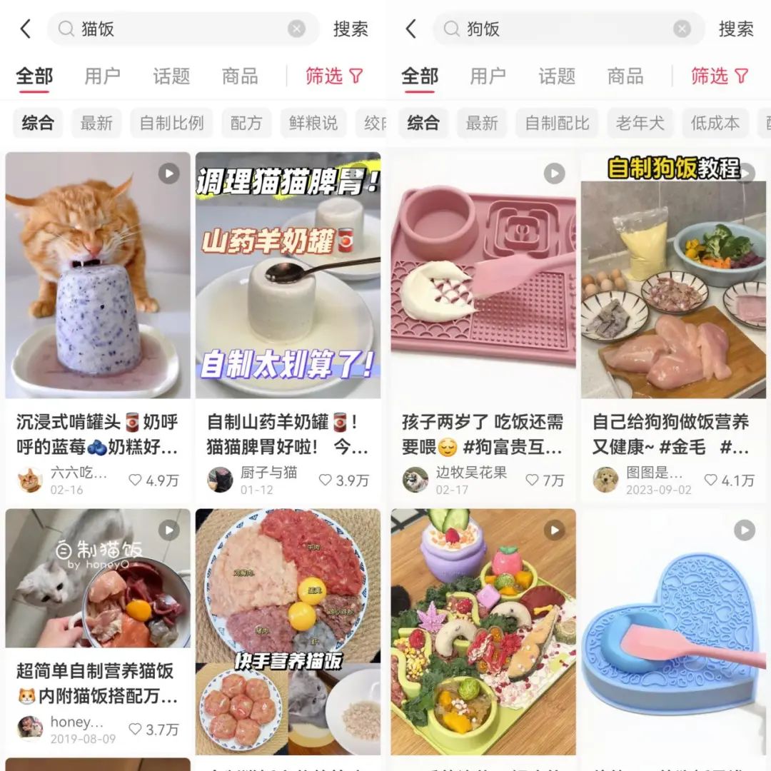 在小紅書隨手搜索“貓飯”,有著超過27萬篇筆記,“狗飯”相關話題下,則有著5300萬的瀏覽和超過25萬條的討論,滿屏都是“貓飯比人飯貴”“狗飯配比吊打輕食店”的凡爾賽文學。