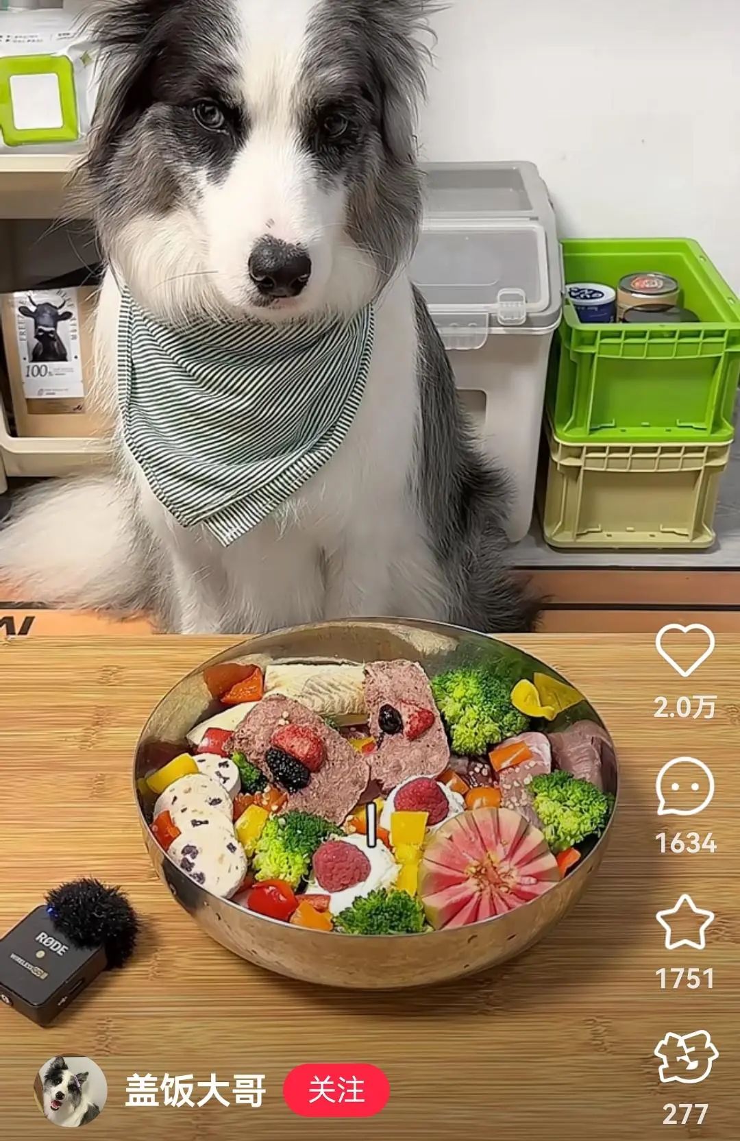 三文魚配牛肉藍莓的美毛套餐、雞胸肉配青口貝的減脂料理、牛肉豬肝西藍花混搭的營養(yǎng)碗……視頻里的人慢條斯理地給碗里放上各種高端食材和補劑,隨后,一只狗狗出現(xiàn)在鏡頭里開始“干飯”。