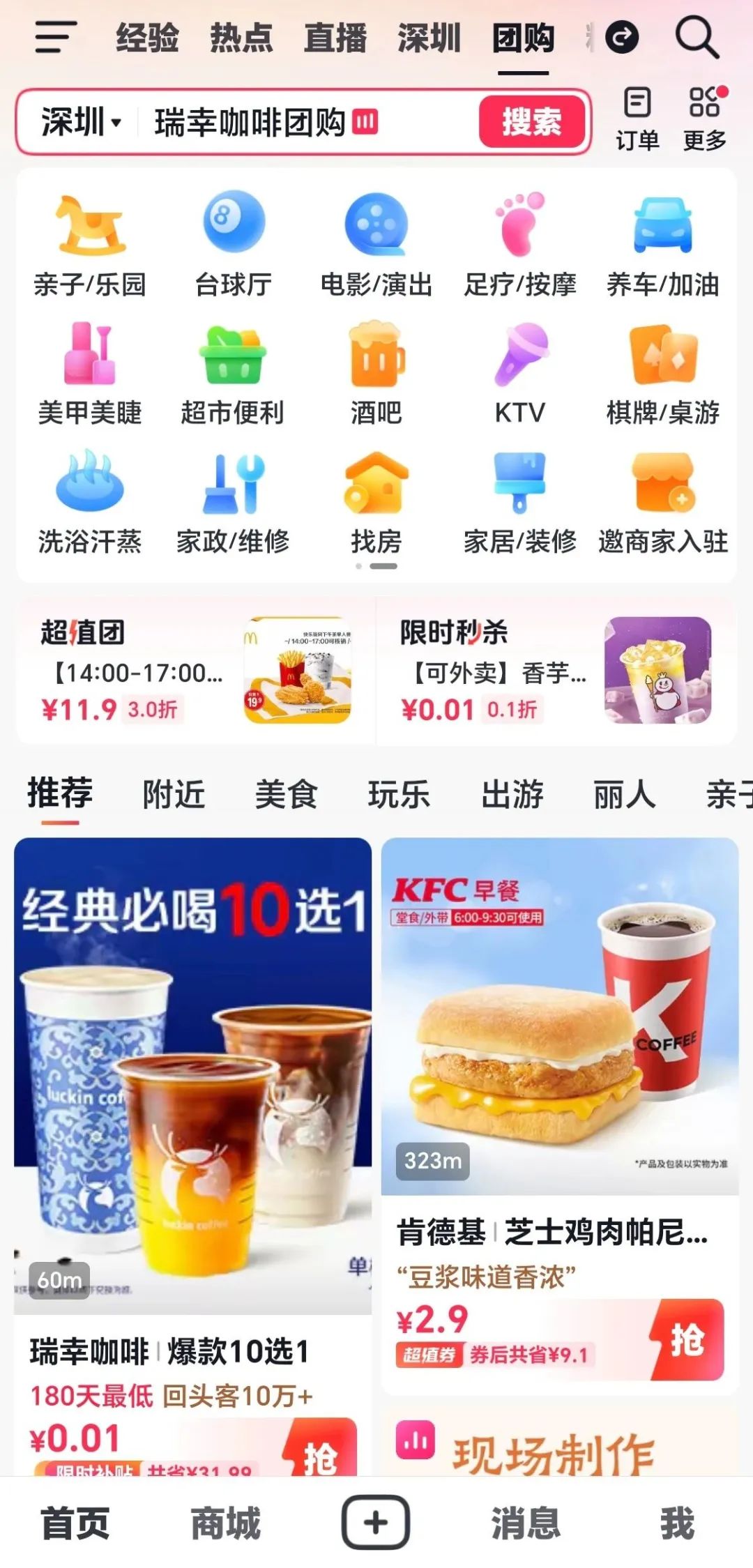 打開(kāi)抖音APP的團(tuán)購(gòu)入口,可以發(fā)現(xiàn)平臺(tái)的團(tuán)購(gòu)服務(wù)一級(jí)入口多達(dá)25個(gè),包括但不限于親子/樂(lè)園、電影/演出、足療/按摩,養(yǎng)車(chē)/加油等各種多樣化的生活服務(wù)類別。