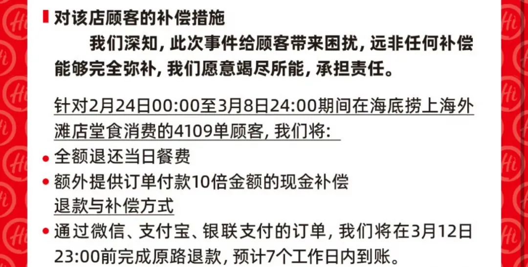 “針對(duì)2月24日00:00至3月8日24:00期間在海底撈上海外灘店堂食消費(fèi)的4109單顧客,將全額退還當(dāng)日餐費(fèi),并額外提供訂單付款10倍金額的現(xiàn)金補(bǔ)償。”
