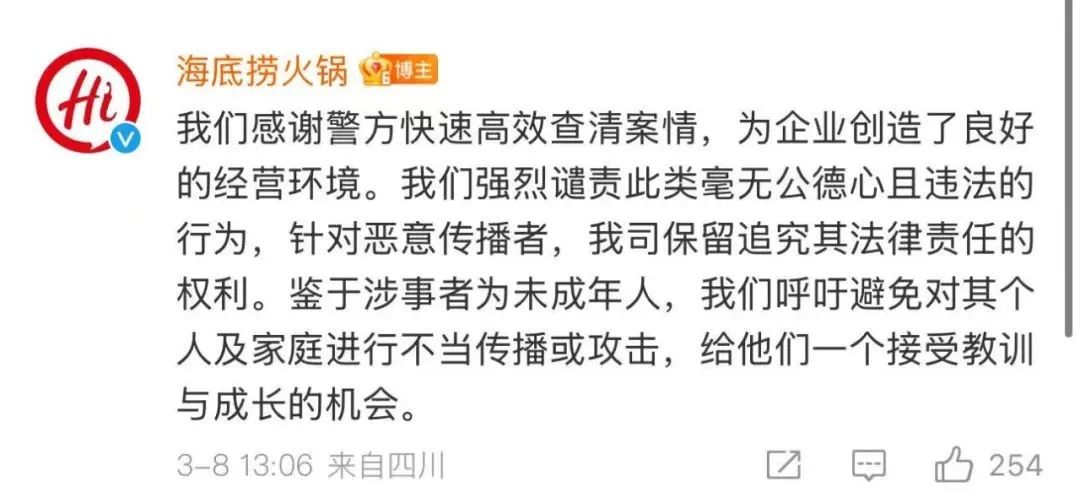 事情的關(guān)鍵轉(zhuǎn)折點(diǎn)在于3月8日警情通報(bào)后海底撈的評(píng)論回復(fù)。在回應(yīng)中,海底撈表示,“針對(duì)惡意傳播者,我司保留追究其法律責(zé)任的權(quán)利。鑒于涉事者為未成年人,我們呼吁避免對(duì)其個(gè)人及家庭進(jìn)行不當(dāng)傳播或攻擊,給他們一個(gè)接受教訓(xùn)與成長(zhǎng)的機(jī)會(huì)。”