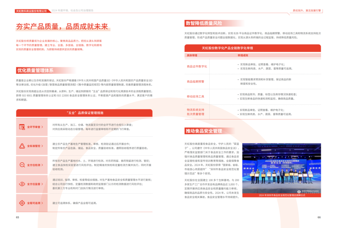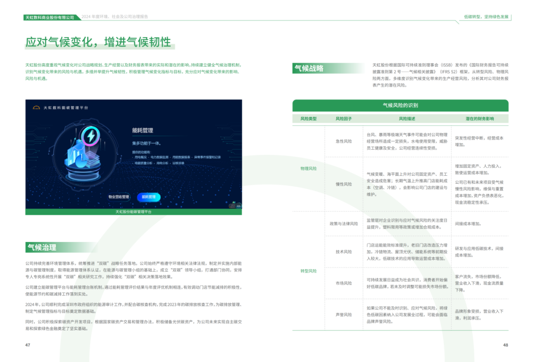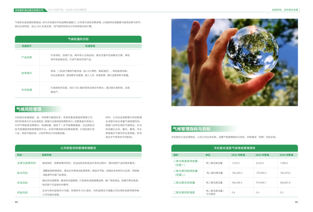 日前,天虹股份發(fā)布2024年度環(huán)境、社會(huì)及公司治理報(bào)告(ESG報(bào)告),天虹方面表示,ESG不僅是企業(yè)高質(zhì)量發(fā)展的必由之路,更是時(shí)代賦予天虹的使命與擔(dān)當(dāng)。