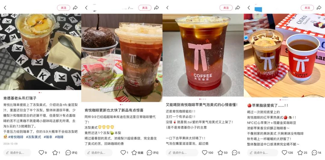 蘋果氣泡美式采用“NFC紅心蘋果汁+金獎豆現(xiàn)磨咖啡+現(xiàn)制氣泡水”的組合,首創(chuàng)了“蘋果美式”的風潮。這意味著肯悅具有品類創(chuàng)新的能力,能建立獨特的產(chǎn)品符號,取得先發(fā)優(yōu)勢。